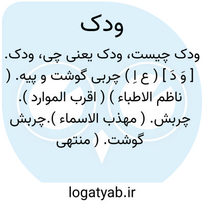 ودک. [ وَ دِ ] ( ع ص ) لحم ودک؛ گوشت فربه پیه ناک. ( اقرب الموارد ) ( منتهی الارب ) ( آنندراج ).