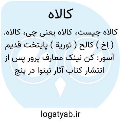 کالاه. ( اِخ ) کالح ( توریة ) پایتخت قدیم آسور: کن نینک معارف پرور پس از انتشار کتاب آثار نینوا در پنج جلد توسط فرانسویان در تپه نمرود محل کالاه یا کالح توریة پایتخت قدیم آسور به حفریات پرداخت و قصر آسوربانی پال پادشاه آسور و حجاری های برجسته بسیار کشف کرد. ( ایران باستان ج 1 ص 52 ). در کتاب قاموس مقدس آورده است: شهری است از شهرهای قدیم آشور که نمرود آن را بنا نهاد. گویند: که مدت زمانی شهر مذکور پایتخت مملکت معظم آشور بود. بعضی بر آنند که موقعش در نزد قلعه شرغاطدر کنار دجله بمسافت چهل میل به جنوب نمرود جائی که فعلاً خراب و محیطش سه میل میباشد واقع بوده است و برخی بر آنند که همان نمرود است و در آنجا علامت دیوارمربعی را که آثار برجها و دروازه ها و قصرها در آن دیده میشود یافته اند و برج نمرود نیز از جمله آنها است که ارتفاعش 140 قدم است. ( از قاموس کتاب مقدس ).