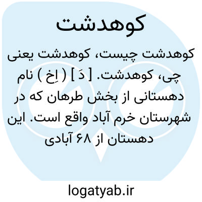 کوهدشت. [ دَ ] ( اِخ ) نام دهستانی از بخش طرهان که در شهرستان خرم آباد واقع است. این دهستان از 68 آبادی تشکیل شده و قرای مهم آن عبارتند از: سراب، میری، ابوالوفا، رزده، و ننک دار اریکا. آثار چند قلعه مخروبه و دو بقعه ٔخرابه به نام داودرش و ابوالوفا در این دهستان باقی مانده است. جمعیت دهستان در حدود 16000 تن می باشد که از طوایف امرائی، گراوند، آزادبخت، عباسی، زرونی وکوفانی می باشند. ( از فرهنگ جغرافیایی ایران ج 6 ).