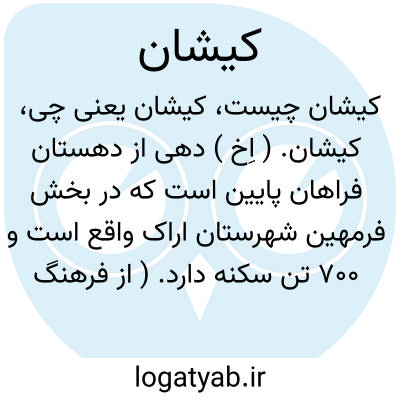 کیشان. ( اِخ ) دهی از دهستان فراهان پایین است که در بخش فرمهین شهرستان اراک واقع است و 700 تن سکنه دارد. ( از فرهنگ جغرافیایی ایران ج 2 ).