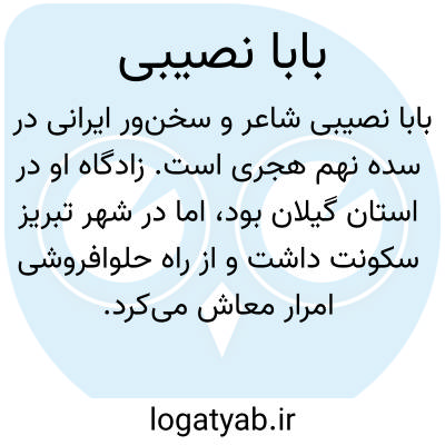 بابانصیبی. [ ن َ ] ( اِخ ) مولدش در گیلان اما در تبریز به حلوافروشی میگذرانید و از شهد کلام کام خاص و عام را شیرین ساخته و آخرالامر به وساطت بابافغانی شیرازی بخدمت سلطان یعقوب ترکمان رفته شرف منادمت یافت، و هم در تبریز بعالم بقا شتافت. این چند بیت ازو ملاحظه و انتخاب و در این کتاب ثبت شد: