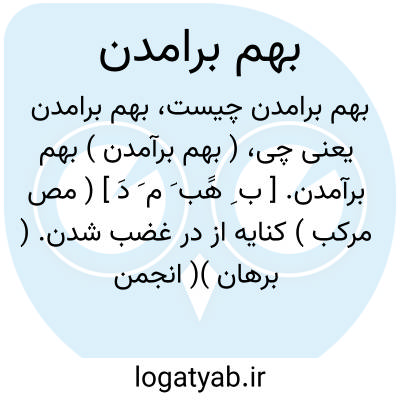 ( بهم برآمدن ) بهم برآمدن. [ ب ِ هََب َ م َ دَ ] ( مص مرکب ) کنایه از در غضب شدن. ( برهان )( انجمن آرا ) ( از غیاث ) ( از رشیدی ). خشم گرفتن. ( آنندراج ). غضبناک شدن. ( ناظم الاطباء ) ( فرهنگ فارسی معین ). || برآشفتن. بشوریدن: و همه را دست گیر کردند و ایشان بهم برآمدند و شمشیر در یکدیگر نهادند. ( فارسنامه ابن البلخی ص 81 ). و فی الجمله سپاه و رعیت بهم برآمدند و برخی از بلاد از قبضه تصرف او بدر رفت. ( گلستان ). ملک بهم برآمد و روی در هم کشید. ( گلستان ). || بیدماغ شدن. ( آنندراج ). تنگدل شدن. اندوهگین شدن. ( فرهنگ فارسی معین ). || آشوفته شدن. منقلب شدن: کرمان بوفات او بهم برآمد. ( المضاف الی بدایعالازمان ص 6 ).
