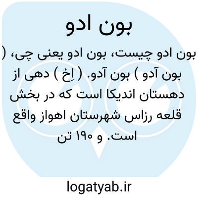 ( بون آدو ) بون آدو. ( اِخ ) دهی از دهستان اندیکا است که در بخش قلعه رزاس شهرستان اهواز واقع است. و 190 تن سکنه دارد. ( از فرهنگ جغرافیائی ایران ج 6 ).