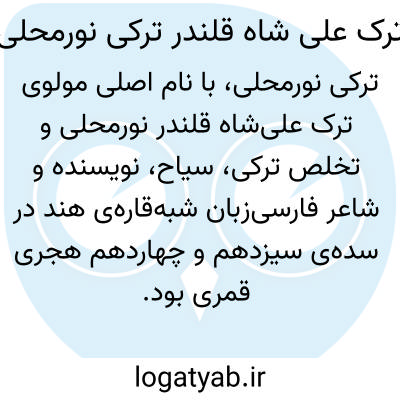 [ویکی فقه] ترکی نورمحلی، مولوی ترک علی شاه قلندر نورمحلی متخلص به ترکی (۱۲۴۲-۱۳۳۲ق/۱۸۲۶-۱۹۱۴م)، سیاح، نویسنده و شاعر فارسی گوی شبه قاره بود.