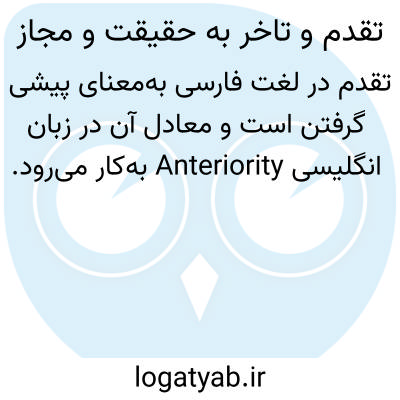 [ویکی فقه] تقدم و تأخر به حقیقت و مجاز. تقدم در لغت فارسی به معنای پیشی است و معادل آن در زبان فرانسه واژه Anteriorite و در زبان انگلیسی، واژه Anteriority است. در اصطلاح فلسفی پیشی عبارت است از موجودیت چیزی قبل از چیز دیگر، در مرتبت اول بطوری که شی ء دوم فقط پس از ایجاد شی ء اول ایجاد شود.