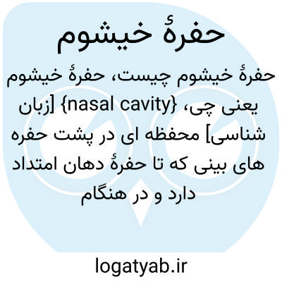{nasal cavity} [زبان شناسی] محفظه ای در پشت حفره های بینی که تا حفرۀ دهان امتداد دارد و در هنگام پایین آمدن ملاز، جریان هوا از آن عبور می کند و به تولید آواهای خیشومی یا خیشومی شده منجر می شود متـ. خیشوم