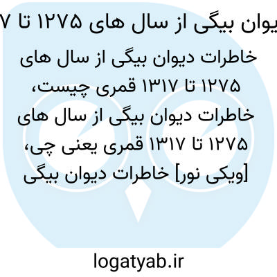 [ویکی نور] خاطرات دیوان بیگی (میرزا حسین خان) از سال های 1275 تا 1317 قمری (کردستان و طهران). "خاطرات دیوان بیگی از سال های 1275 تا 1317 ه.ق" به کوشش ایرج افشار و محمد رسول دریاگشت صورت گرفته است. خاطرات دیوان بیگی سرگذشتی است، خودنوشت از میرزا حسین دیوان بیگی کردستانی، مشتمل بر سوانح زندگانی او در دوران اقامت کردستان و سپس از روزگار سکونتش در تهران، به انضمام یادداشت های پراکنده ای که در سنوات گوناگون تا سال 1331 قمری نوشته است.