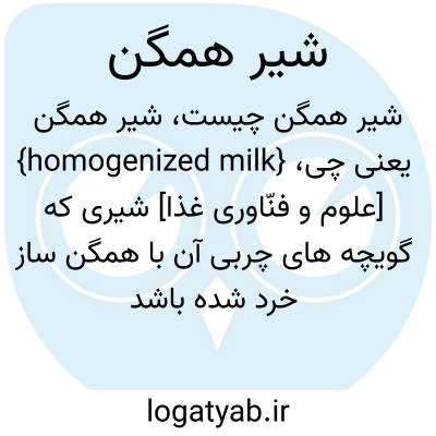 {homogenized milk} [علوم و فنّاوری غذا] شیری که گویچه های چربی آن با همگن ساز خرد شده باشد