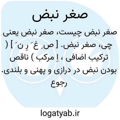 صغر نبض. [ ص ِ غ َ رِ ن َ ] ( ترکیب اضافی، اِ مرکب ) ناقص بودن نبض در درازی و پهنی و بلندی. رجوع به رگ شناسی ابن سینا چ انجمن آثار ملی ص 23 شود.