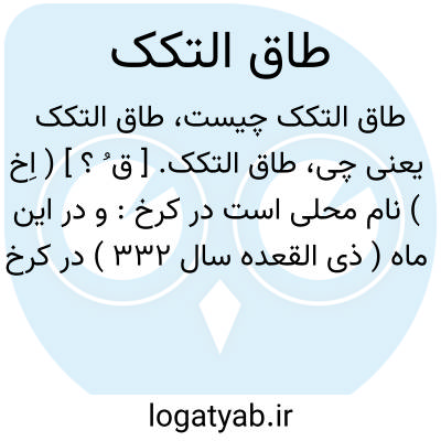 طاق التکک. [ ق ُ ؟ ] ( اِخ ) نام محلی است در کرخ: و در این ماه ( ذی القعده سال 332 ) در کرخ حریقی عظیم روی داد که از حد طاق التکک تا سماکین را فرا گرفت. ( از اخبارالراضی باللّه ص 261 ).