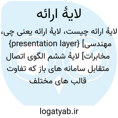 {presentation layer} [مهندسی مخابرات] لایۀ ششم الگوی اتصال متقابل سامانه های باز که تفاوت قالب های مختلف داده ای، مانند شناسۀ نویسه ها، را پنهان می کند و خدمات ارتباطی شفاف را بین سامانه های ناهمسان فراهم می آورد