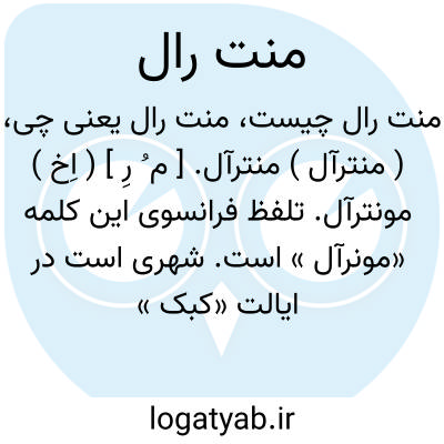 ( منترآل ) منترآل. [ م ُ رِ ] ( اِخ ) مونترآل. تلفظ فرانسوی این کلمه «مونرآل » است. شهری است در ایالت «کبک » کانادا که در کنار رود «سن لوران » واقع است و 1222000 تن سکنه دارد. این شهر در سال 1642 م. بنام «ویل -ماری » پایه گذاری شد و در قرن 19 میلادی یکی از مراکز مهم بازرگانی و سپس یکی از مراکز صنعتی مشرق کانادا به شمار آمد و در سال 1967 م. نمایشگاه بین المللی امتعه در آنجا تأسیس یافت.این شهر کلیسائی کهن و دانشگاه معروفی ( دانشگاه مک گیل ) دارد و بندرگاه عظیم آن مشهور است. ( از لاروس ).