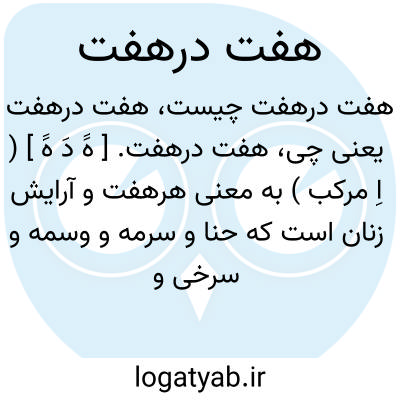 هفت درهفت. [ هََ دَ هََ ] ( اِ مرکب ) به معنی هرهفت و آرایش زنان است که حنا و سرمه و وسمه و سرخی و سفیدآب و زرک و غالیه باشد در هفت جا که دست و پا و چشم و ابرو و هر دو جانب رو ( که به عربی خدین گویند ) و تمام رخسار که آن را سفیدآب مالند و هم زرک پاشند و بدن است، به کار برند. ( از برهان ):