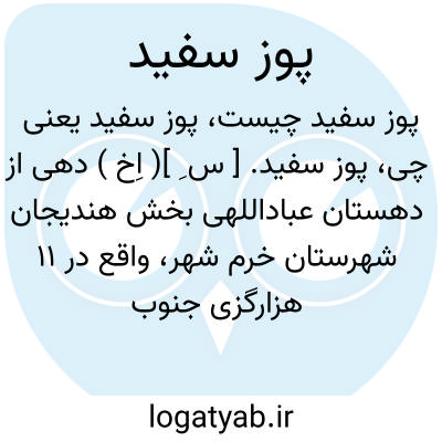 پوز سفید. [ س ِ ]( اِخ ) دهی از دهستان عباداللهی بخش هندیجان شهرستان خرم شهر، واقع در 11 هزارگزی جنوب باختری هندیجان. سر راه فرعی اتومبیل رو هندیجان بساحل خلیج فارس. دارای پنجاه تن سکنه. ( از فرهنگ جغرافیائی ایران ج 6 ).