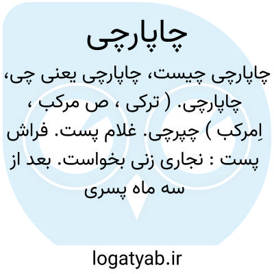 چاپارچی. ( ترکی، ص مرکب، اِمرکب ) چپرچی. غلام پست. فراش پست: نجاری زنی بخواست. بعد از سه ماه پسری بیاورد. از پدرش پرسیدند این پسر را چه نام نهیم ؟ گفت چون نه ماهه به سه ماه آمده او را چاپارچی نام باید کرد. ( منتخب لطائف عبید زاکانی چ برلین ص 138 ). و رجوع به چپرچی شود.