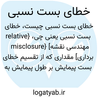 {relative misclosure} [مهندسی نقشه برداری] مقداری که از تقسیم خطای بست پیمایش بر طول پیمایش به دست می آید و عموماً به صورت کسری از عدد یک بیان می شود