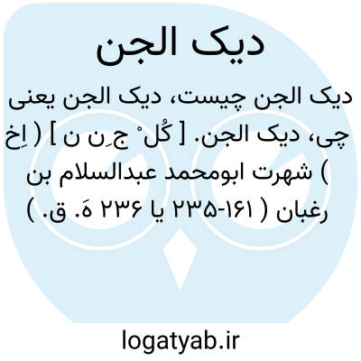 دیک الجن. [ کُل ْ ج ِن ن ] ( اِخ ) شهرت ابومحمد عبدالسلام بن رغبان ( 161-235 یا 236 هَ. ق. ) شاعر عرب متوفی در حمص، شیعه بود. اشعاری در مرثیه امام حسین ( ع ) دارد. همه عمر رادر سوریه گذرانید و در خلافت متوکل درگذشت. رجوع به الاعلام زرکلی ج 1 ص 312 و ج 2 ص 520 و الوزراء و الکتاب جهشیاری ص 69، تاریخ الخلفاء 237 و الموشح ص 349 شود: