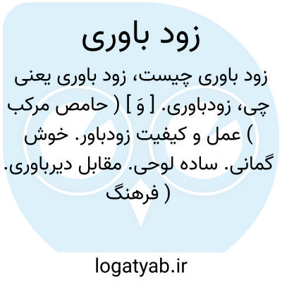 زودباوری. [ وَ ] ( حامص مرکب ) عمل و کیفیت زودباور. خوش گمانی. ساده لوحی. مقابل دیرباوری. ( فرهنگ فارسی معین ). خوش باوری. سهل القبولی.