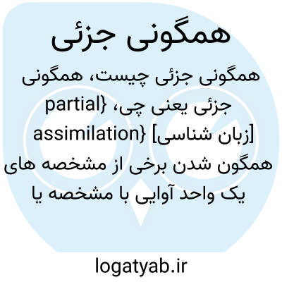 {partial assimilation} [زبان شناسی] همگون شدن برخی از مشخصه های یک واحد آوایی با مشخصه یا مشخصه های واحد آوایی دیگر متـ. همگونی ناقص incomplete assimilation