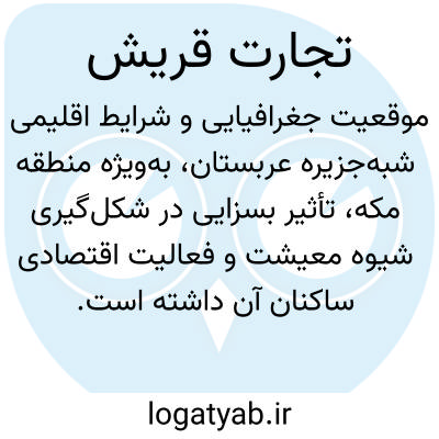 [ویکی فقه] به دلیل اوضاع نامناسب جوی و غیر قابل کشت بودن زمین، شغل اصلی اهالی مکه عموما تجارت بوده و هاشم بن عبد مناف در توسعه تجارت قریش نقش بسزائی داشته است.