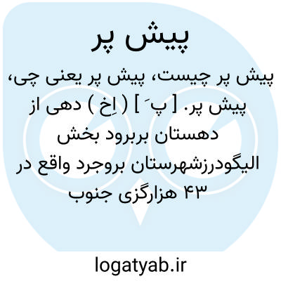 پیش پر. [ پ َ ] ( اِخ ) دهی از دهستان بربرود بخش الیگودرزشهرستان بروجرد واقع در 43 هزارگزی جنوب الیگودرز کنار راه مالرو چشمه ویران به قلعه هومه. کوهستانی و معتدل، دارای 109 تن سکنه. آب آنجا از چاه و قنات. محصول آن غلات و لبنیات. شغل اهالی آنجا زراعت و گله داری و راه آن مالروست. ( فرهنگ جغرافیایی ایران ج 6 ).