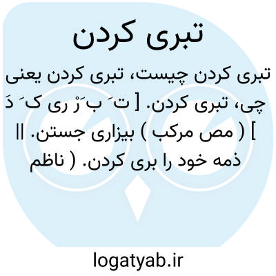 تبری کردن. [ ت َ ب َرْ ری ک َ دَ ] ( مص مرکب ) بیزاری جستن. || ذمه خود را بری کردن. ( ناظم الاطباء ).