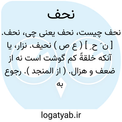 نحف. [ ن َ ح ِ ] ( ع ص ) نحیف. نزار، یا آنکه خلقةً کم گوشت است نه از ضعف و هزال. ( از المنجد ). رجوع به نحیف شود.