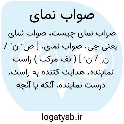 صواب نمای. [ ص َ ن ُ / ن ِ / ن َ ] ( نف مرکب ) راست نماینده. هدایت کننده به راست. درست نماینده. آنکه یا آنچه صواب را بنماید: بر ضمیر صواب نمای صاحبقران سعادت انتما خطور نمود. ( حبیب السیر چ 1تهران ص 124 ). به اقتضای رأی صواب نمایش میسر. ( حبیب السیر چ 1 تهران ج 3 ص 1 ). و رجوع به صواب نمودن شود.