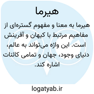 هیرما به معنای گستره‌ای از مفاهیم مرتبط با کیهان و آفرینش است. این واژه می‌تواند به عالم، دنیای وجود، جهان و تمامی کائنات اشاره کند. در واقع، این واژه به عنوان نمادی از تمامیت هستی و گیتی عمل می‌کند. همچنین، به دهر و مکان نیز اشاره دارد، به معنای زمان و فضایی که در آن زندگی می‌کنیم. این تعابیر، نمایانگر ارتباط عمیق انسان با عالم اطرافش و درک او از وجود و هستی می‌باشند. به عبارت دیگر، این کلمه می‌تواند بر تمامی ابعاد وجودی ما تأثیر بگذارد و بینش ما نسبت به جهان را شکل دهد. این واژه به ما یادآوری می‌کند که هر یک از ما بخشی از این کیهان بزرگ هستیم و در این راستا، درک و شناخت ما از آن می‌تواند به توسعه آگاهی و فهم ما از زندگی و موجودیت کمک کند.