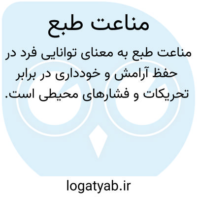 مناعت طبع به معنای توانایی فرد در حفظ آرامش و خودداری در برابر تحریکات و فشارهای محیطی است. این ویژگی به افراد کمک می‌کند تا در موقعیت‌های دشوار و چالش‌برانگیز، به جای واکنش‌های احساسی و غیرمنطقی، با عقل و منطق عمل کنند. این کلمه نه تنها یک خصیصه فردی بلکه یک مهارت ضروری در تعاملات اجتماعی و حرفه‌ای به شمار می‌رود. افرادی که دارای این ویژگی هستند، معمولاً در موقعیت‌هایی که ممکن است احساسی و متشنج شوند، قادرند با خونسردی بیشتری به مسائل نگاه کنند و تصمیمات بهتری اتخاذ نمایند. این ویژگی در محیط‌های کاری و اجتماعی به ویژه در زمان‌هایی که فشار روانی و استرس وجود دارد، اهمیت بیشتری پیدا می‌کند. این واژه به افراد این امکان را می‌دهد که به جای تمرکز بر مشکلات، به راه‌حل‌ها بیندیشند و به صورت سازنده با چالش‌ها مواجه شوند. در واقع، این خصیصه به نوعی زینت روحی و روانی به حساب می‌آید که می‌تواند بر کیفیت روابط فردی و اجتماعی اثرگذار باشد. به همین دلیل، پرورش مناعت طبع در خود و دیگران می‌تواند به بهبود کیفیت زندگی و روابط انسانی کمک شایانی کند و به افراد این امکان را بدهد که در مواجهه با چالش‌ها و تنش‌ها، با آرامش و اطمینان بیشتری عمل کنند.