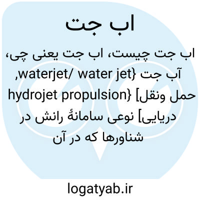فرهنگستان زبان و ادب آب جت{waterjet/ water jet, hydrojet propulsion} [حمل ونقل دریایی] نوعی سامانۀ رانش در شناورها که در آن پروانه ای آب را با فشار از درون افشانک ها عبور می دهد و باعث حرکت شناور می شود