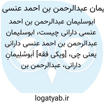 [ویکی فقه] اَبوسُلِیمانِ دارانی، عبدالرحمن بن احمد بن عطیّة عنسی دارانی، از عرفای سده ۲ ـ ۳ق بود.برخی نیز او را با انتساب به نام جدش، عبدالرحمن بن عطیه گفته اند.