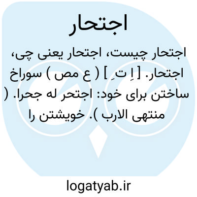 لغت نامه دهخدا اجتحار. [ اِ ت ِ ] ( ع مص ) سوراخ ساختن برای خود: اجتحر له جحرا. ( منتهی الارب ). خویشتن را سوراخی ساختن ( تاج المصادر بیهقی )، چنانکه موش و روباهی.