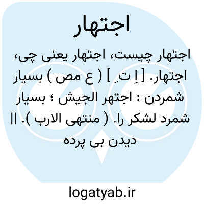 اجتهار. [ اِ ت ِ ] ( ع مص ) بسیار شمردن: اجتهر الجیش؛ بسیار شمرد لشکر را. ( منتهی الارب ). || دیدن بی پرده کسی را و دیداری یافتن او را: اجتهر الرجل. ( منتهی الارب ). || پاک کردن، چنانکه چاه را: اجتهر البئر؛ پاک کرد چاه را یا کشید همه آب آن را. ( منتهی الارب ). || بزرگ داشتن چیزی درچشم. ( تاج المصادر ). بزرگ آمدن حال کسی. ( زوزنی ).