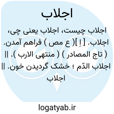 اجلاب. [ اِ ]( ع مص ) فراهم آمدن. ( تاج المصادر ) ( منتهی الارب ). || اجلاب الدّم؛ خشک گردیدن خون. || اجلاب الجرح؛ پوست فراهم آوردن جراحت و به شدن. ( منتهی الارب ). || یاری دادن. ( تاج المصادر ) ( منتهی الارب ). || اجلب العوذة؛ در چرم دوخت تعویذ را. || اجلاب اِبِل؛ نر زادن شتران. || خداوند شتران نر شدن. ( تاج المصادر ). || ترسانیدن. ( منتهی الارب ). || اجلب القَتَب؛ بچرم خام پوشانید پالان را تا خشک گردید. ( منتهی الارب ). پوست بر پالان یا زین کردن. ( زوزنی ). || اجلاب فرس؛ بانگ زدن بر اسب وقت دوانیدن تا درگذرد. زجر کردن اسب. ( منتهی الارب ). بانگ بر ستور زدن تا سبقت گیرد. ( تاج المصادر ). || حیله کردن برای اهل خود و کسب کردن. ( منتهی الارب ). || فراهم کردن گروهی و بانگ کردن آنها. گرد کردن.