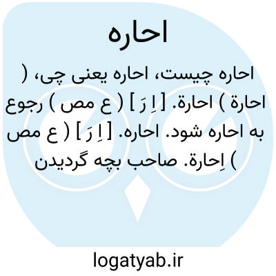 احاره. [ اِ رَ ] ( ع مص ) اِحارة. صاحب بچه گردیدن: احارت الناقة. ( منتهی الارب ). || جواب بازدادن. ( زوزنی ): مااحار جواباً؛ جواب بازنداد. ( منتهی الارب ). || افزونی کردن آسیا. ( تاج المصادر ). || طحنت فمااحارت شیئاً؛ بیرون نداد چیزی از آرد. ( منتهی الارب ).