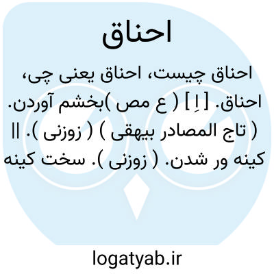 احناق. [ اِ ] ( ع مص )بخشم آوردن. ( تاج المصادر بیهقی ) ( زوزنی ). || کینه ور شدن. ( زوزنی ). سخت کینه گرفتن. || احناق زرع؛ از غلاف برآمدن و منتشر شدن خازهای خوشه زراعت. || باریک کوهان و میان شدن. ( تاج المصادر بیهقی ). باریک شدن کوهان شتر. || احناق حمار؛ باریک شدن و لاغر و نزار شدن خر اولاغ از بسیاری گشنی: احنق الحمار. || اِحناق صُلب؛ چسبیدن پشت بشکم و همچنین است: اِحناق سنام.