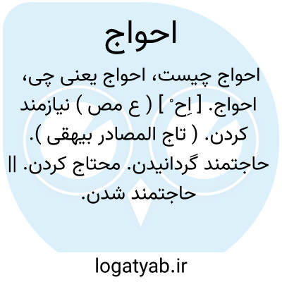 لغت نامه دهخدا احواج. [ اِح ْ ] ( ع مص ) نیازمند کردن. ( تاج المصادر بیهقی ). حاجتمند گردانیدن. محتاج کردن. || حاجتمند شدن. محتاج شدن. نیازمند گشتن. ( تاج المصادر بیهقی ).احواج. [ اَح ْ ] ( ع اِ ) ج ِ حاجت.