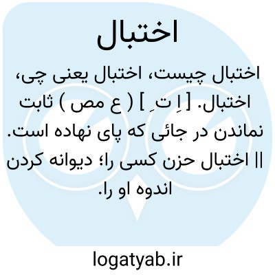 اختبال. [ اِ ت ِ ] ( ع مص ) ثابت نماندن در جائی که پای نهاده است. || اختبال حزن کسی را؛ دیوانه کردن اندوه او را. تباه شدن خرد از اندوه. گم کردن خرد. ( زوزنی ). تباه خرد گردانیدن. ( تاج المصادر بیهقی ). تخبیل. || ناقص گردانیدن. ( زوزنی ). نقصان عضوی کردن. ( آنندراج ).