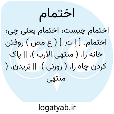 اختمام. [ اِ ت ِ ] ( ع مص ) روفتن خانه را. ( منتهی الارب ). || پاک کردن چاه را. ( زوزنی ). || بُریدن. ( منتهی الارب ). || سخت گرم شدن و زبانه کشیدن آتش. || برجوشیدن دل از خشم. || سخت سرخ شدن خون.