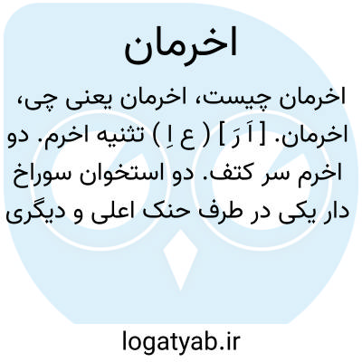 اخرمان. [ اَ رَ ] ( ع اِ ) تثنیه اخرم. دو اخرم سر کتف. دو استخوان سوراخ دار یکی در طرف حنک اعلی و دیگری در دو کتف از جانب بازو و دو زائده که در طرف گو کتف است ودر سر کتف گوی که زائده سر استخوان بازو در آن است و طرف این گو دو زائده دارد یکی بالا و دیگری زیر.
