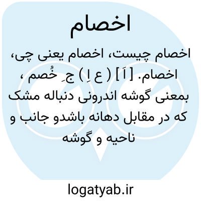 لغت نامه دهخدا اخصام. [ اَ ] ( ع اِ ) ج ِ خُصم، بمعنی گوشه اندرونی دنباله مشک که در مقابل دهانه باشدو جانب و ناحیه و گوشه یعنی دسته. || اخصام العین؛ آنچه بر آن استوار است کرانه های پلک چشم.