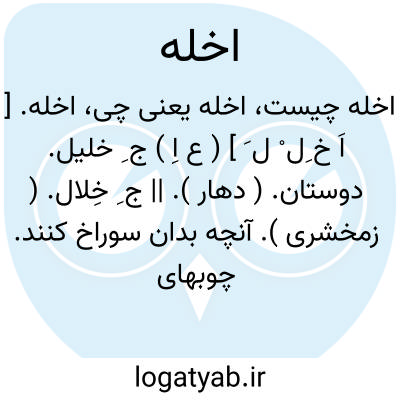 اخله. [ اَ خ ِل ْ ل َ ] ( ع اِ ) ج ِ خلیل. دوستان. ( دهار ). || ج ِ خِلال. ( زمخشری ). آنچه بدان سوراخ کنند. چوبهای خلال دندان. || جج ِ خِلّة، بمعنی نیام شمشیر پوست پوشانیده و هر بطانه که نیام شمشیر را پوشانند و روده که بر سرهای کمان برگشته باشد و پوست با نقش و نگار. ( منتهی الارب ).