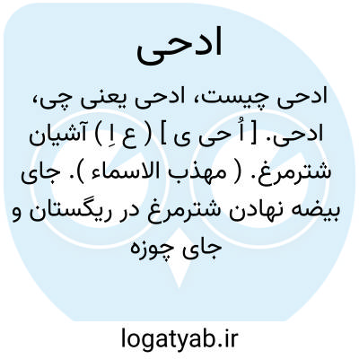 لغت نامه دهخدا ادحی. [ اُ حی ی ] ( ع اِ ) آشیان شترمرغ. ( مهذب الاسماء ). جای بیضه نهادن شترمرغ در ریگستان و جای چوزه برآوردن آن. اُدحیّه. اُدحوّه. ج، اَداحی.