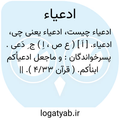 ادعیاء. [ اَ ] ( ع ص، اِ ) ج ِ دَعی. پسرخواندگان: و ماجعل ادعیأکم ابنأکم. ( قرآن 4/33 ). || آنانکه در نسب خود متهم باشند. پسرانی که اولادالزّناء باشند. ( آنندراج ).
