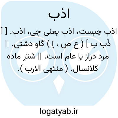 لغت نامه دهخدا اذب. [ اَ ذَب ب ] ( ع ص، اِ ) گاو دشتی. || مرد دراز یا عام است. || شتر ماده کلانسال. ( منتهی الارب ).
