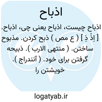 اذباح. [ اِذْ ذِ ] ( ع مص ) ذبح کردن. مذبوح ساختن. ( منتهی الارب ). ذبیحه گرفتن برای خود. ( آنندراج ). خویشتن را ذبیح ساختن. ( زوزنی ). کشتن ساختن. ( تاج المصادر بیهقی ).