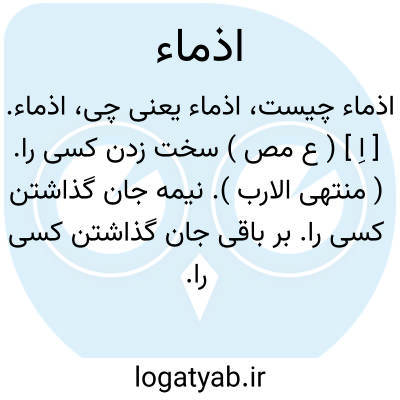 اذماء. [ اِ ] ( ع مص ) سخت زدن کسی را. ( منتهی الارب ). نیمه جان گذاشتن کسی را. بر باقی جان گذاشتن کسی را. ( منتهی الارب ). بر باقی جان گذاشتن نیم مرده ای را.
