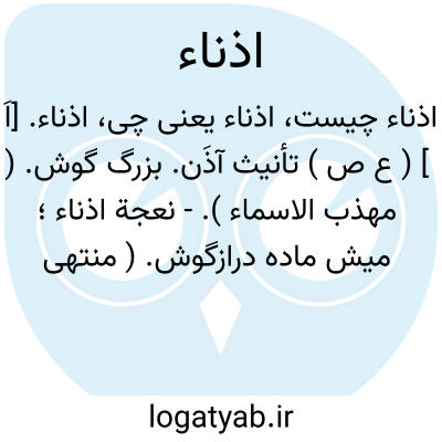 لغت نامه دهخدا اذناء. [اَ ] ( ع ص ) تأنیث آذَن. بزرگ گوش. ( مهذب الاسماء ).- نعجة اذناء؛ میش ماده درازگوش. ( منتهی الارب ).