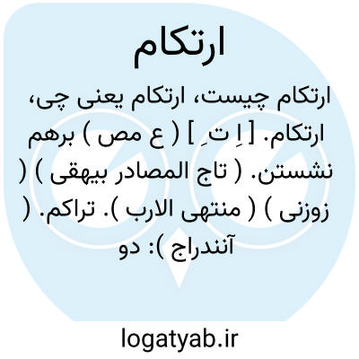 ارتکام. [ اِ ت ِ ] ( ع مص ) برهم نشستن. ( تاج المصادر بیهقی ) ( زوزنی ) ( منتهی الارب ). تراکم. ( آنندراج ): دو هزار سوار و پیاده بفرستاد تا در مکامن آجام بوقت ارتکام ظلام بر او شبیخون کنند و روی زمین از وی خالی گردانند. ( ترجمه تاریخ یمینی ص 127 ). || گرد آمدن. ( منتهی الارب ).